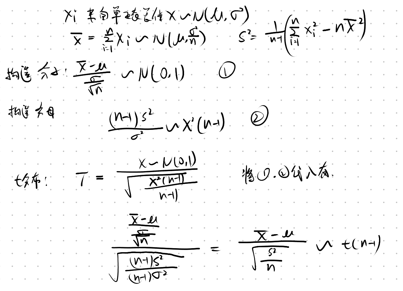 我们构造的表达式完全符合 t 分布的定义,并且化简后得到了我们想要的目标统计量.其自由度为 的自由度,即 .