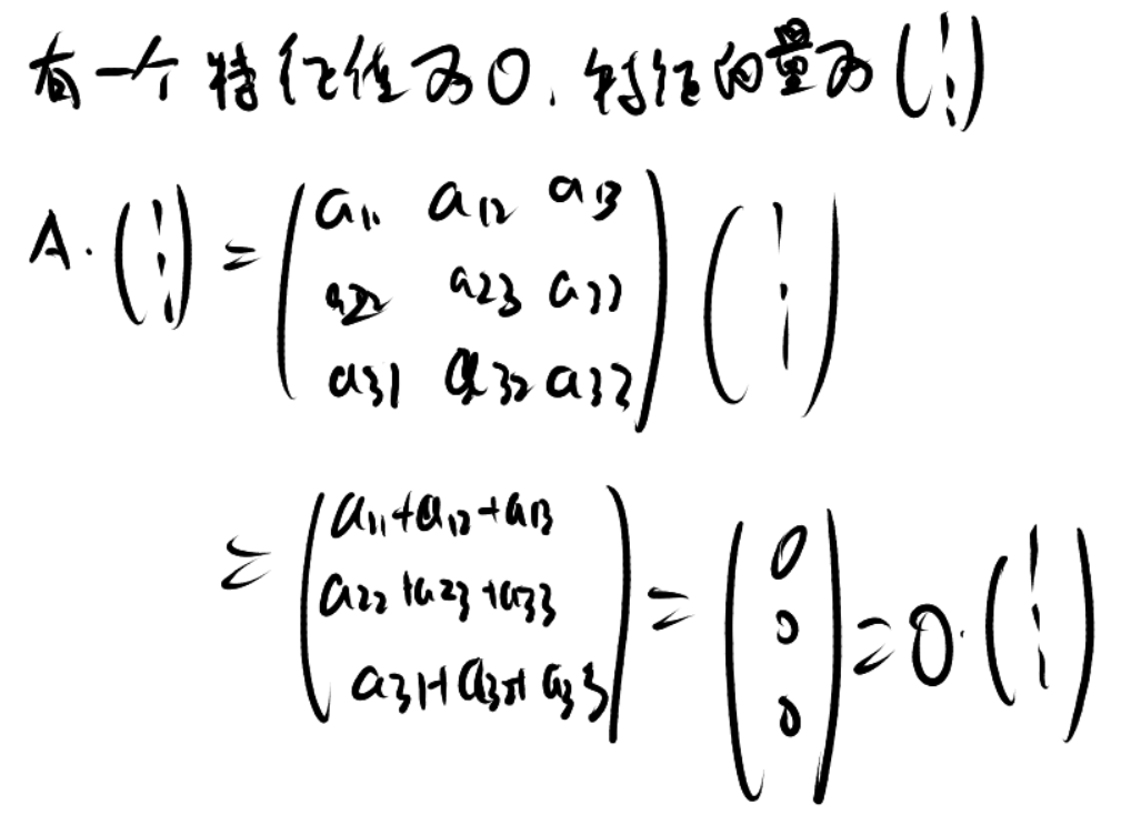 Q: 为什么 A 的各行元素之和均为 0, 则 A 存在一个特征值为 0, 其对应的特征向量为 ?