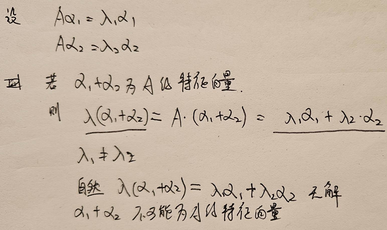 Q: 为什么不同特征值的特征向量之和不是特征向量? 用特征向量的定义证明