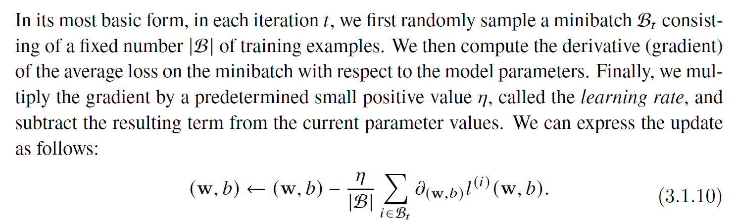 🔤在训练达到预定的迭代次数(或满足其他停止准则)后,我们记录估计的模型参数,记为ŵ、b̂。需要注意的是,即使函数是严格线性且无噪声的,这些参数也不会是损失的精确最小化点,甚至不具备确定性。尽管算法会缓慢向最小化点收敛,但通常在有限步数内无法精确找到它们。此外,用于更新参数的小批量样本B是随机选取的,这破坏了确定性。🔤