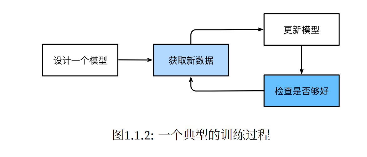 在机器学习中,学习(learning)是一个训练模型的过程。通过这个过程,我们可以发现正确的参数集, 从而使模型强制执行所需的行为。换句话说,我们用数据训练(train)模型。如 图1.1.2所示,训练过程通常 包含如下步骤: 1. 从一个随机初始化参数的模型开始,这个模型基本没有“智能”; 2. 获取一些数据样本(例如,音频片段以及对应的是或否标签); 3. 调整参数,使模型在这些样本中表现得更好; 4. 重复第(2)步和第(3)步,直到模型在任务中的表现令人满意。