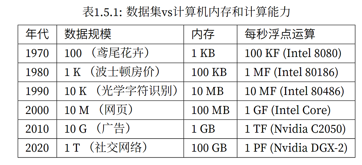 大约2010年开始,那些在计算上看起来不可行的神经网络算法变得热门起来,实际上是以下两点导致的:其 一,随着互联网的公司的出现,为数亿在线用户提供服务,大规模数据集变得触手可及;另外,廉价又高质 量的传感器、廉价的数据存储(克莱德定律)以及廉价计算(摩尔定律)的普及,特别是GPU的普及,使大 规模算力唾手可得。
